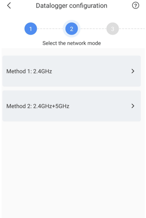iv: Velg metode 1: 2.4:GHz (hvis du får valget mellom "standard" og "hotspot" så skal "hotspot mode" benyttes. Fungerer ikke hotspot, så kan du benytte standard mode. Brukernavnet her er dataloggeren sitt serienummer, og standard-passordet til dataloggeren er 12345678.)